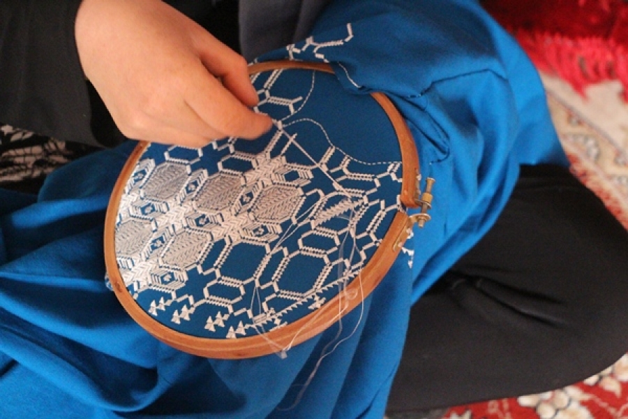 سکینه سالهاست که اطلس دوزی میکند او میگوید این هنر خیلی زحمت دارد و نهایت تلاشش را میکند که این هنر را مردم بشناسند اما در این زمینه هیچگونه همکاری با وی صورت نگرفته است.