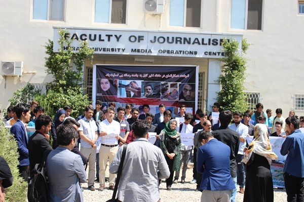 دانشجویان دانشکدۀ ژورنالیزم و ارتباطات جمعی دانشگاه هرات با شعار«ما پیکر آزادی بیان را بر دوش میکشیم» در واکنش به جان باختن و زخمی شدن شماری از خبرنگاران در کابل امروز دست به اعتراض زدند.