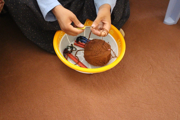نخهای بافتنی را با قلاب (وسیلهی که با آن نخها را میبافند) به هم گره میزند، تا گرهی از مشکلات زندگی اش را باز کند.