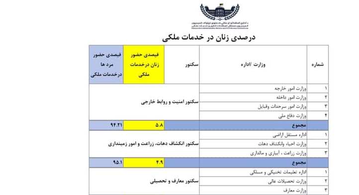 بر اساس آماری که کمیسیون اصلاحات اداری و خدمات ملکی منتشر کرده است، زنان 27.3 درصد از کارکنان خدمات ملکی را تشکیل میدهند. این آمار، نشان دهندهی افزایش 5 درصدی حضور زنان در ادارههای دولتی را در سال 97 نشان میدهد.