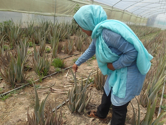 فاطمه صالحی، یکی از زنانی که مصروف پرورش گیاه آلوئهورا است، میگوید: «آلوئهورا را به شکل طبیعی پرورش میدهیم و در ترکیب کود آن از مواد شیمیایی استفاده نمیکنیم .»