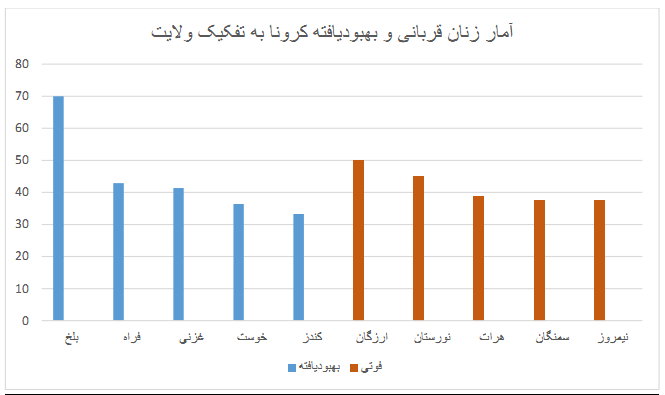 براساس دادههای اطلاعاتی وزارت صحت عامه، ولایتهای کابل 30.4 درصد، ، هرات 16.92 درصد، بلخ 16.74 درصد، غزنی 5.28 درصد و ننگرهار 4.7 درصد به ترتیب بیشترین آمار قربانیان زن را دارد. در کنار این ولایتهای کابل 38درصد، هرات 24درصد، بلخ 4.5درصد، سمنگان 4درصد و ننگرهار 2.9 درصد با داشتن بیشترین آمار بهبودیافتههای زنان، در صدر جدول قرار دارند.