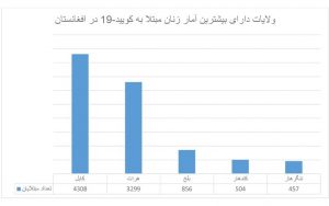 از 30.84 درصد مبتلایان خانم در افغانستان تا اکنون بیش از 77درصد یا 10 هزار و 346 مورد بهبود یافته و 33 درصد جان باخته اند. ولایت کابل با داشتن 32.13 درصد مبتلایان زن در صدر جدول قرار دارد و ولایات هرات، بلخ، کندهار و ننگرهار به ترتیب، بیشترین آمار مبتلایان زن را به خود اختصاص داده اند.