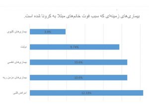 وی اضافه کرد، از مجموع 462 خانمی که بر اثر ویروس کرونا جان باخته اند، 12.33 درصد شان از امراض قلبی و عروقی، 10.6 درصد از بیماری مزمن ریه، 10.6 درصد از بیماریهای تنفسی، 9.74 درصد از بیماریهای دیابت و 3.9 درصد از بیماریهای کلیوی رنج میبردند.