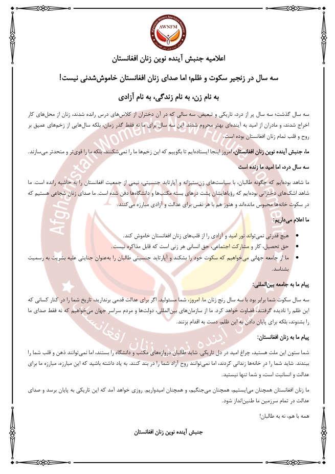 جنبش آیندهی نوین زنان افغانستان، با نشر اعلامیهای گفته که سه سال گذشته پر از «درد، رنج، تاریکی و تبعیض» برای زنان و دختران بوده است.