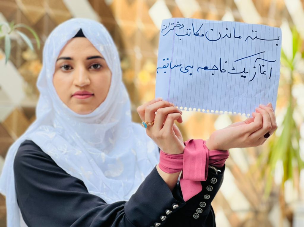 همچنان امینه، یکی از دانشآموزان صنف ششم در یک مکتب خصوصی است. او همیشه با انگیزه به مکتب میرفت و تلاش میکرد تا بهترین نمرهها را در آزمونهای سالانه کسب کند. حضور در صنف برایش بخش جداییناپذیر زندگی بوده و رابطه نزدیکی با دوستان و آموزگارانش دارد؛ اما ممنوعیت آموزش از سوی طالبان همهی اینها را از او گرفته و اکنون خانهنشین و نگران است.
