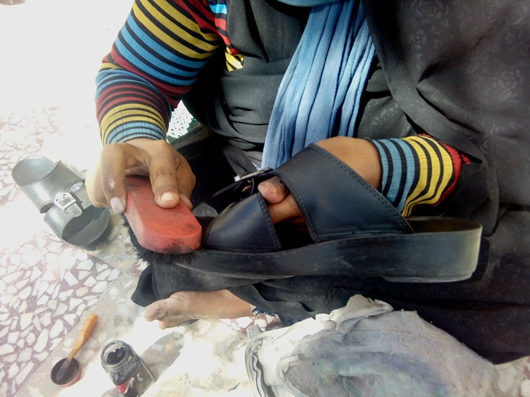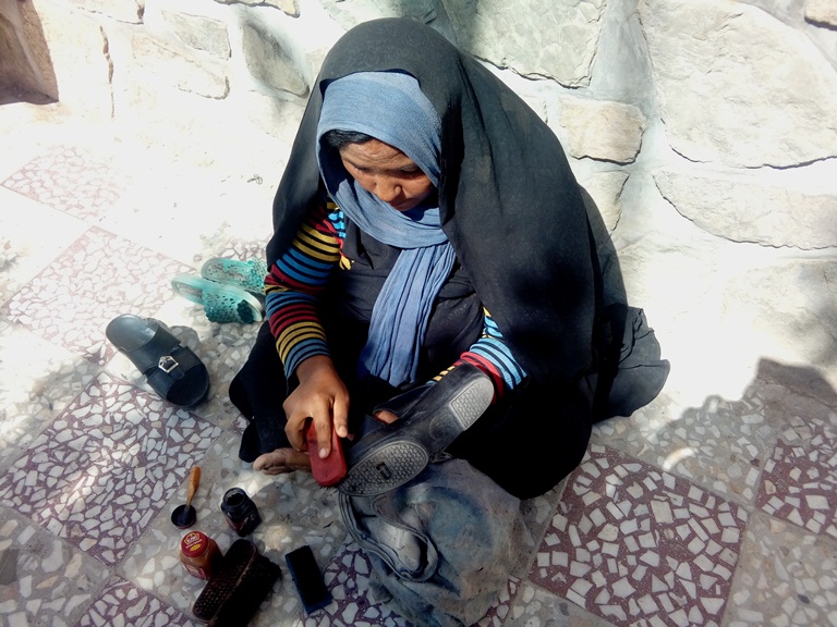 مریم میگوید:”هر روز به امید اینکه کفشهای بیشتری را رنگ دهم از خانه بیرون میشوم. غرورممان اجازه نمیداد دست گدایی پیش کنیم، چند افغانی را برس و رنگ خریدیم.”