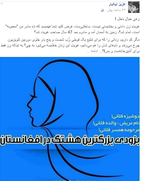 در حالی از تابو بودن نام زنان بحث میشود که شمار زیادی از زنان امروز در افغانستان هویت شان مجهول بوده و گرفتن نام شان هتک حرمت پنداشته میشود تا جایی که روی سنگ قبر شماری از آنان به جای نام شان، مادر فلانی، خواهر فلانی و همسر فلانی به چشم میخورد.