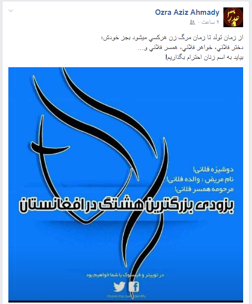 بنا به گفتههای وی این هشتگ در مورد نگاه مالکانه مردان در جامعه افغانی و ننگ و ناموس شمردن زنان در جامعه پدر سالاری است، چنانچه که بردن نام زنان در بعضی از ولایات و حتی شهرها منجر به جریحه دار شدن غیرت مردان میشود.