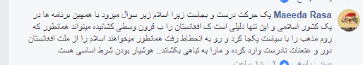 اما در کنار این افراد، عدهای نیز از این حرکت استقبال کرده و حمایت شان را از عالمان دین اعلام کرده اند. چنانچه مائده رسا نوشته است که: «یک حرکت درست و بجاست. زیرا اسلام زیر سوال میرود به همچین برنامهها در یک کشور اسلامی و این تنها دلیلی است که افغانستان به به قرون وسطی کشانیده میتواند همانطور که روم مذهب را با سیاست یک جا کرد و رو به انحطاط رفت میخواهند اسلام را از ملت افغانستان دور و عنعنات نادرست وارد کرده و مارا به تباهی بکشانند ».