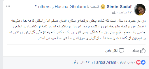 سیمین صدف یکی دیگر از این کاربران با ابراز تعجب از با اهمیت جلوه دادن برنامه ستاره افغان نسبت به تقاضای عمل جنسی یک معلم علوم دین از 20 دانش آموزش نوشته است.